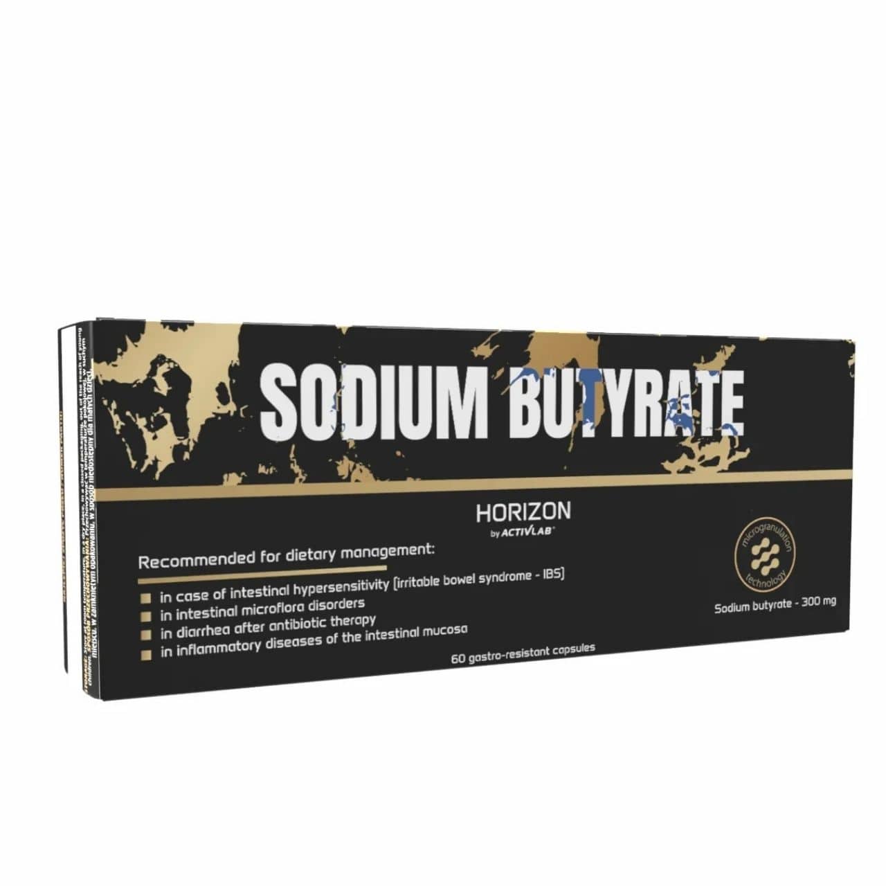 Activlab Horizon Sodium Butyrate is a dietary supplement in vegetarian capsules containing 300 mg of sodium butyrate (the sodium salt of butyric acid) in the form of microgranules in each capsule. The specialised microgranule form ensures the active ingredient is released throughout the entire length of the digestive tract. Cellulose capsules (HPMC) suitable for vegans. Does not contain: gelatine, colourings, flavourings, sweeteners or added sugar.