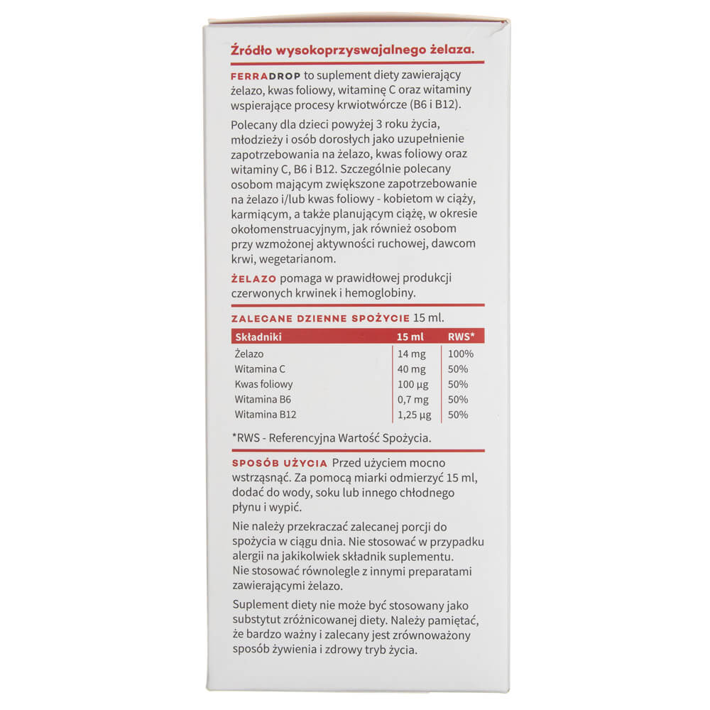 Ferradrop je výživový doplnok od spoločnosti Aura Herbals s obsahom železa + vitamínu C + vitamínu B6, B9 a B12. Špeciálne vlastnosti železa podporuje správnu tvorbu červených krviniek a hemoglobínu podporuje správne fungovanie imunitného systému napomáha udržiavať správne kognitívne funkcie znižuje pocit únavy a vyčerpania Špeciálne vlastnosti kyseliny listovej (vitamín B9) foláty podporujú správne fungovanie imunitného systému foláty napomáhajú správnej tvorbe krvi foláty prispievajú k rastu materského tkaniva počas tehotenstva foláty sa podieľajú na procese delenia buniek