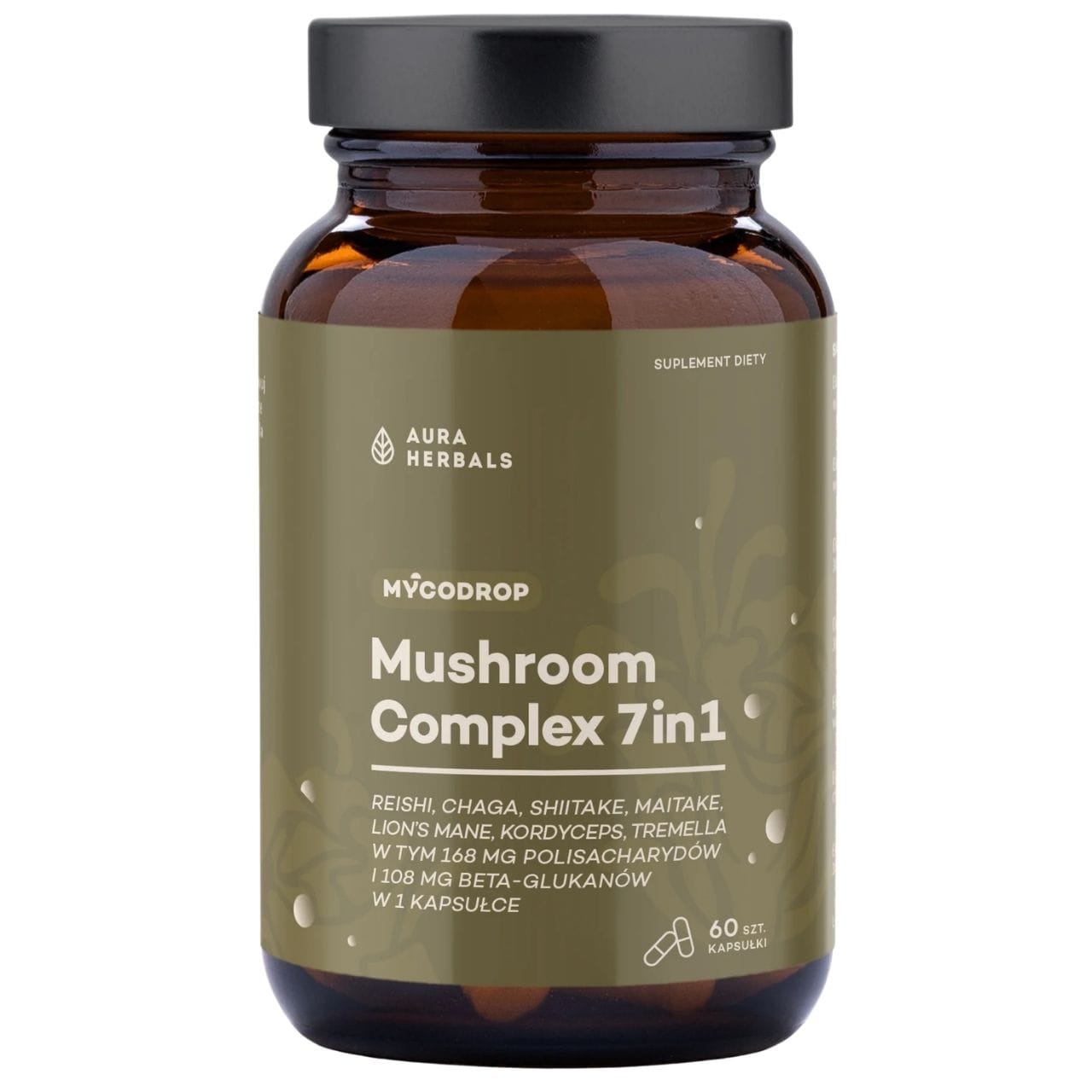 Aura Herbals Mushroom Complex 7-in-1 je doplnok stravy vo vegánskych celulózových kapsulách obsahujúci 7 štandardizovaných extraktov z plodníc funkčných húb (DER 30:1): reishi,, chaga,, shiitake,, maitake,, lion’s mane,, čínsky cordyceps a tremella. 1 kapsula obsahuje celkom 560 mg extraktov, vrátane 168 mg polysacharidov a 108 mg beta-glukánov. Produkt je vegánsky a neobsahuje zbytočné prísady. Neobsahuje: lepok, laktózu, želatínu, farbivá ani konzervačné látky.