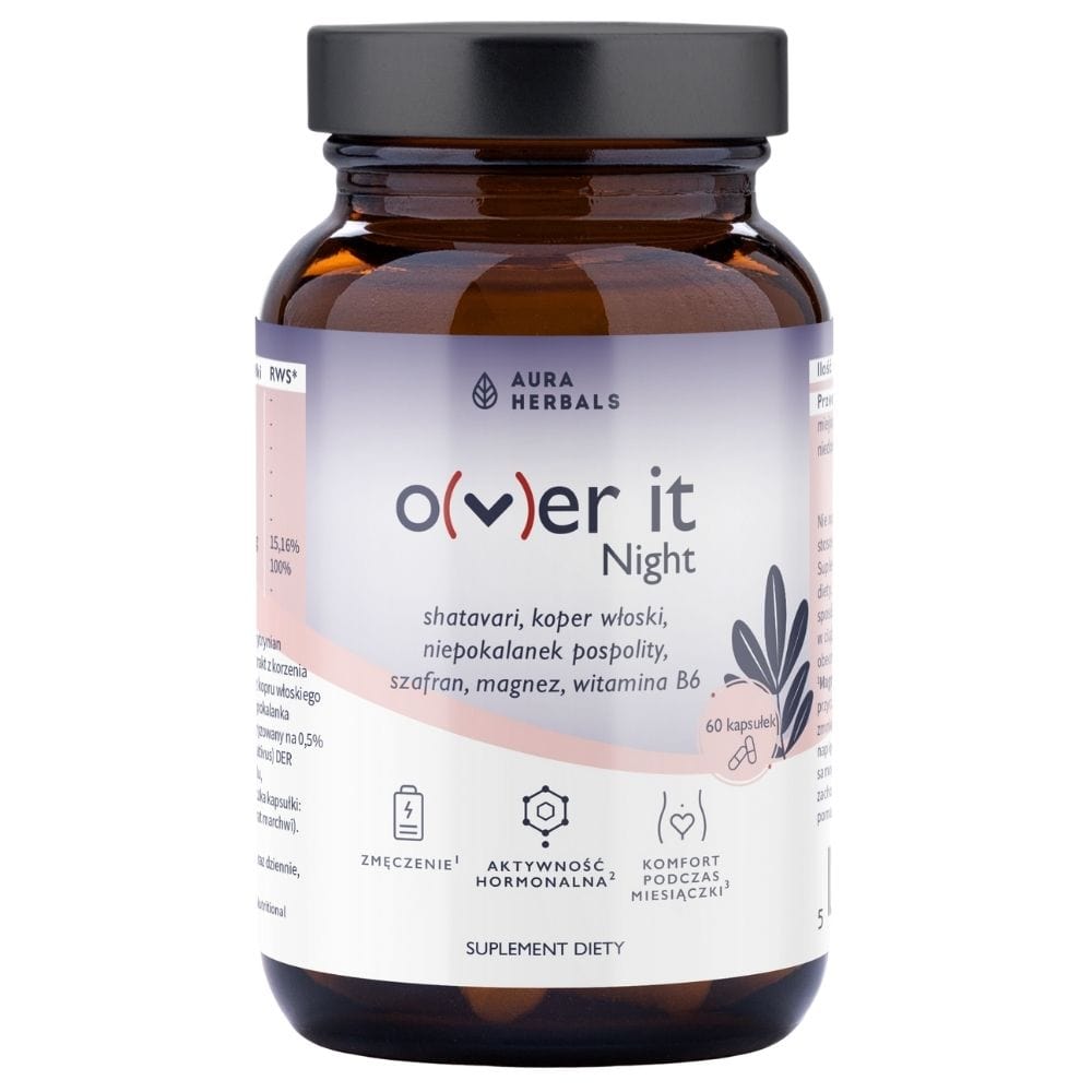Aura Herbals Over It Night je doplnok stravy vo forme kapsúl. Zdroj rastlinných extraktov z agátu, šafranu, shatavari, a fenikla. Zloženie je obohatené o horčík a vitamín B6 (Quali ® -B).