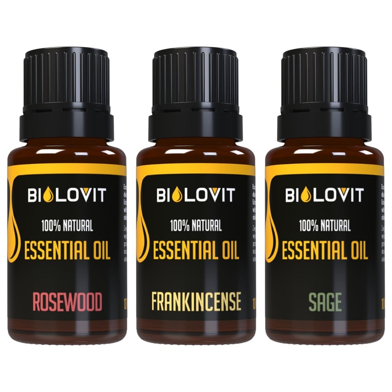 Sada esenciálnych olejov na meditáciu od Bilovitu. Sada na meditáciu sa skladá z olejov - ružové drevo , kadidlo a šalvia .