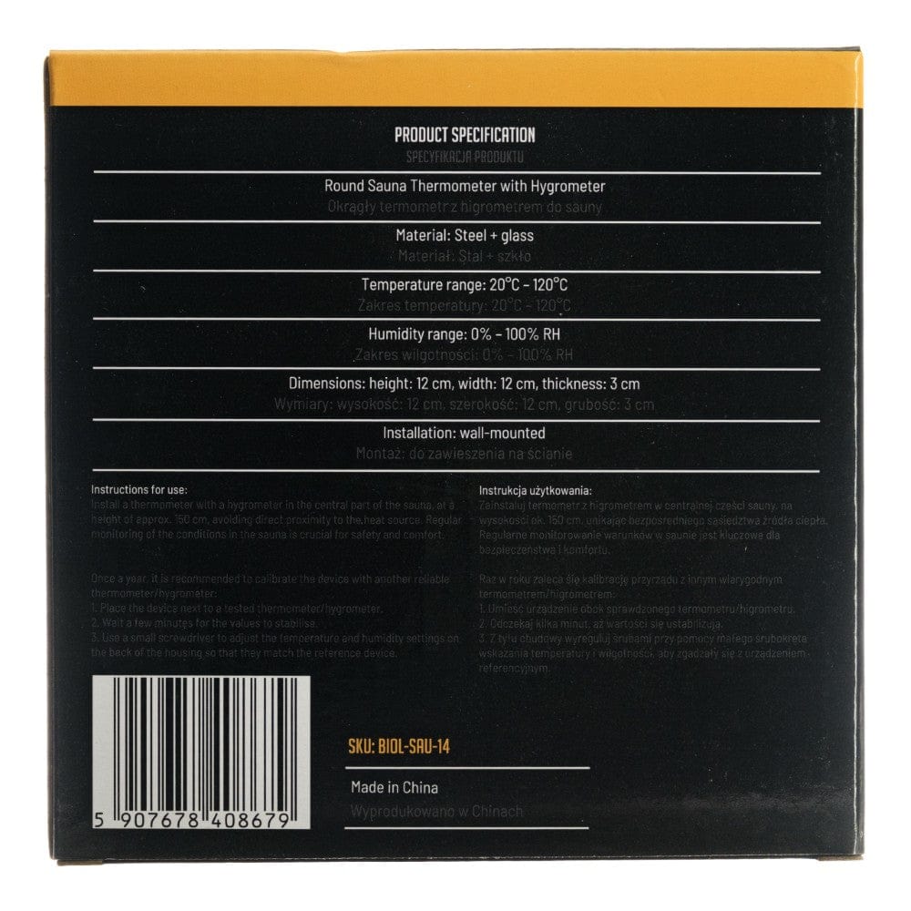 Guľatý saunový teplomer s vlhkomerom Bilovit je elegantný nástroj na presné meranie teploty (20-120 °C) a vlhkosti (0-100%) v saune. Vyrobený z odolnej ocele a skla, zaručuje dlhú životnosť a štýlový vzhľad. Jeho kompaktné rozmery (12 x 12 x 3 cm) a jednoduchá inštalácia vo výške 150 cm z neho robia dokonalý doplnok každej sauny, zaručujúci pohodlné a bezpečné saunovanie.