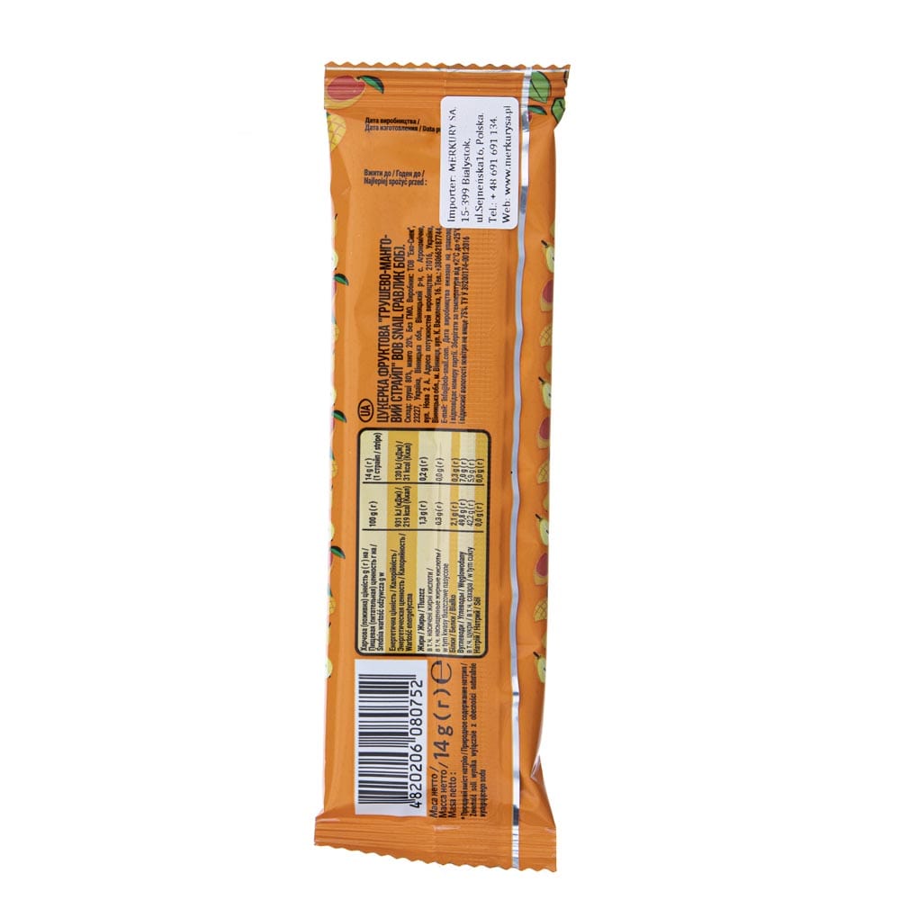 Bob Snail hruška - mango sú prírodné ovocné snacky od výrobcu Eco-Snack. Na ich prípravu bolo použité ovocie a nič iné! Vo výrobkoch Bob Snail nenájdete žiadne konzervačné látky, žiadne farbivá a žiadny pridaný cukor. Bob Snail výrobky sú vhodné pre vegánov. Hruška - mango snack sa skladá zo 100 % z manga a hrušky.