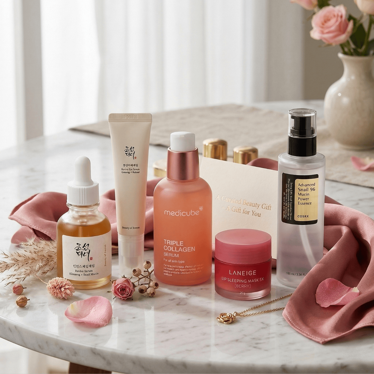 Darčeková sada K-Beauty proti starnutiu spája päť vysokoúčinných základných produktov starostlivosti o pleť s obsahom slimákového mucínu, ženšenu, morského kolagénu a peptidov – niektorých z najuznávanejších zložiek v kórejskej kozmetike. Tento starostlivo zostavený večerný rituál sa zameriava na viditeľné známky starnutia, a obnovuje pevnosť, žiarivosť a hlbokú hydratáciu zrelého pleti. Kórejská kozmetická veda