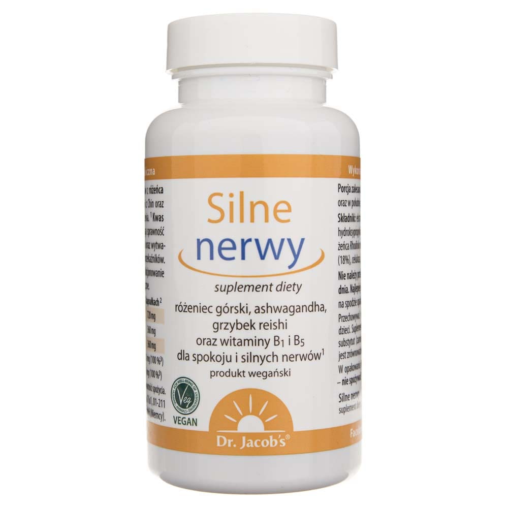 Silné nervy od Dr. Jacob's je výživový doplnok vo forme celulózových kapsúl s obsahom: rhodiola rosea , ashwagandha , huba reishi a vitamíny B1 a B5 pre pokojné a silné nervy.