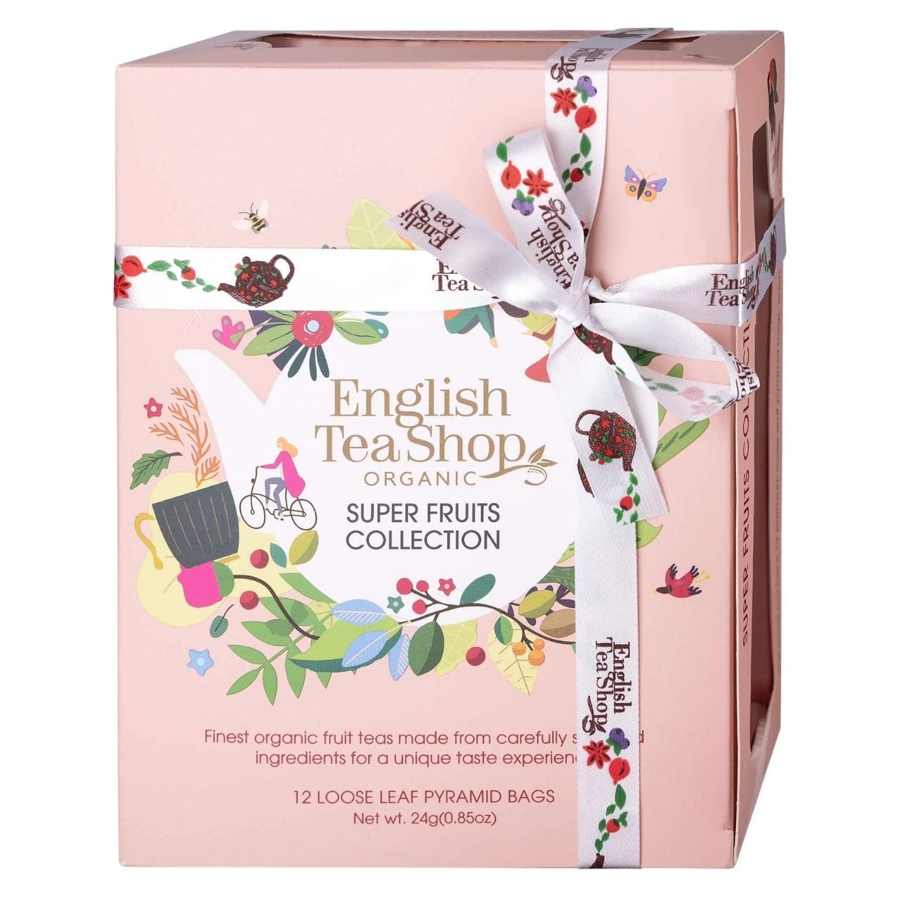 Kolekcia Super Fruits od English Tea Shop je sada 12 pyramídových čajových vrecúšok, ktoré obsahujú po dve vrecúška z každej zo šiestich ovocných a bylinných príchutí. Každá zmes bola vytvorená tak, aby poskytovala bohatstvo vitamínov a prírodných aróm z organického ovocia, bylín a korenín. Všetky čaje pochádzajú z certifikovaných organických fariem a sú balené v biologicky rozložiteľných pyramídových vrecúškach. Elegantné balenie, pripomínajúce luxusnú bonboniéru, robí z tejto sady perfektný darček na každú príležitosť.