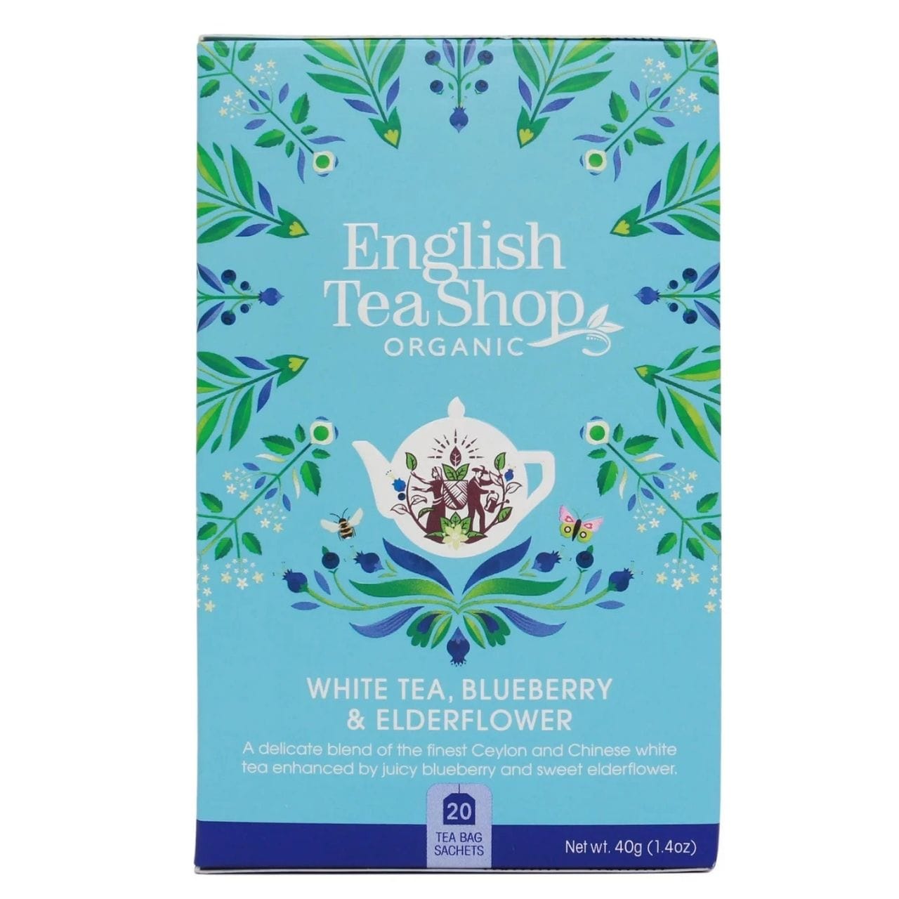 Biely čaj je najdelikátnejší druh čaju, vyrábaný z mladých púčikov a listov, ktoré sa zbierajú len raz ročne. The English Tea Shop kombinuje tento cenovaný čaj so šťavnatými sladkými čučoriedkami a divokými kvetmi bazy čiernej, čím vytvára zmes s neuveriteľne jemnou osviežujúcou chuťou. Pridaním citrónovej trávy získava nálev citrusovú sviežosť, zatiaľ čo prírodná aróma čučoriedok zdôrazňuje ovocný charakter zmesi. Všetky ingrediencie sú certifikované ako organické a balené v biologicky rozložiteľných vrecúškach.