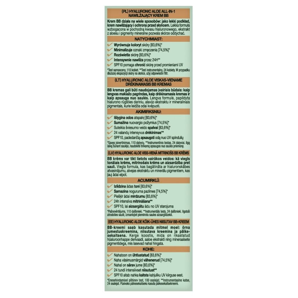 Garnier BB krém je multifunkčný produkt, ktorý v sebe spája vlastnosti ľahkého podkladového krému, a ochrany pred slnkom. Jeho ľahké zloženie, obohatené o derivát kyseliny hyalurónovej, extrakt z aloe vera a minerálne pigmenty, umožňuje pleti dýchať a je vhodný pre všetky typy pleti. BB krém okamžite vyrovnáva tón pleti, minimalizuje známky únavy, rozjasňuje pleť a intenzívne hydratuje počas 24 hodín, pričom poskytuje ochranu SPF10 .