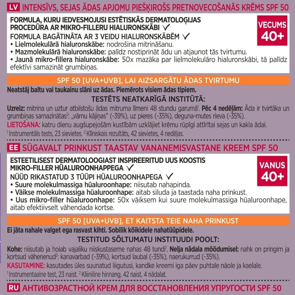 L'Oréal Paris Revitalift Filler Denný krém SPF 50 je inovatívny produkt vytvorený ako odpoveď na komplexné potreby starnúcej pleti. Laboratóriá L'Oréal Paris, inšpirované estetickou Derma tológiou, vyvinuli zloženie, ktoré nielen účinne bojuje proti viditeľným známkam starnutia, ale aj zabraňuje budúcim zmenám spojeným s fotostarnutím.