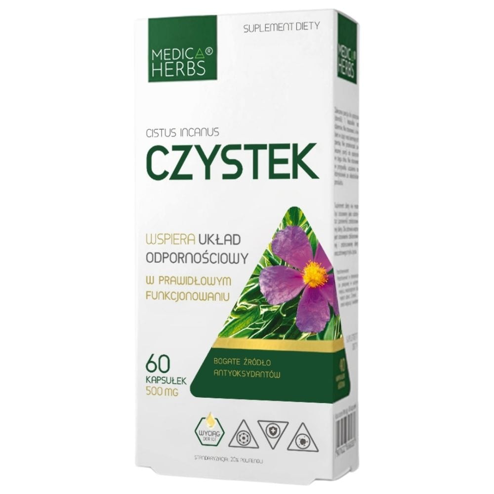 Výživový doplnok v kapsuliach od Medica Herbs. Prípravok obsahuje s 500 mg extraktu zo skalníka (Cistus incanus) štandardizovaného na obsah 20% polyfenolov . Výrobok neobsahuje žiadne umelé prísady, ako sú konzervačné látky, farbivá, arómy, plnidlá.