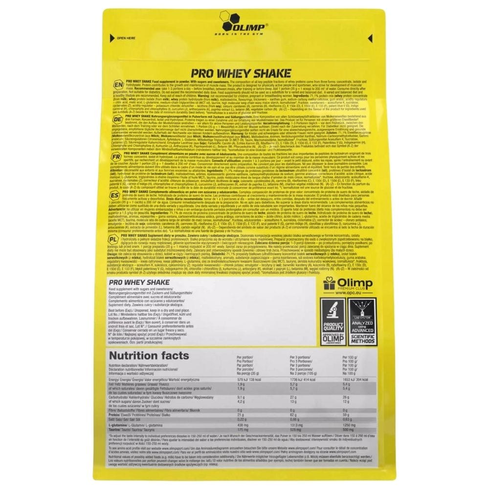 Olimp Pro Whey Shake je výživový doplnok v prášku. Proteínový doplnok vytvorený pre ľudí so zvýšenou potrebou bielkovín zameraných na rozvoj svalovej hmoty, hlavne profesionálnych športovcov a rekreačných cvičencov. Kombinuje tri zdroje bielkovín: hydrolyzát, izolát a srvátkový koncentrát.