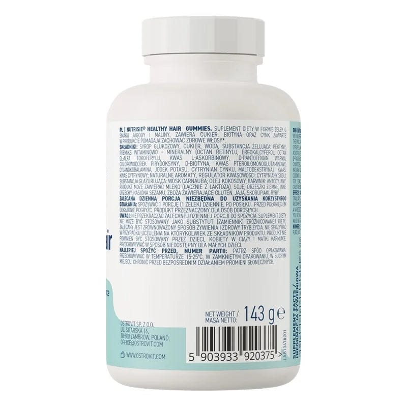Ostrovit NUTRISIE ® Healthy Hair Gummies je komplexný výživový doplnok, ktorý dodáva telu 11 cenných zložiek, vrátane vitamínu D, kyseliny listovej a zinku. Je dostupný vo forme gélov s lahodnou príchuťou bobuľového ovocia a malín. Je to výrobok vytvorený pre ľudí, ktorým záleží na zdravom a krásnom vzhľade.