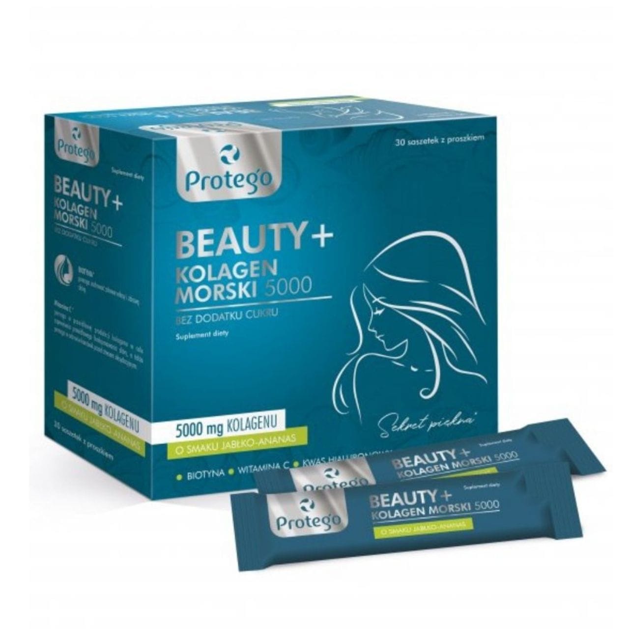 Protego BEAUTY + Marine Collagen 5000 je práškový doplnok stravy v praktických vrecúškach. Jedno vrecúško obsahuje až 5,000 mg kolagénu, vitamínu C, kyseliny hyalurónovej a biotínu.