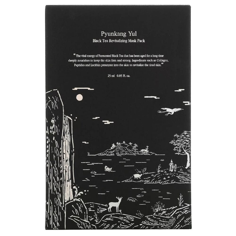 Pyunkang Yul Revitalizačná maska s čiernym čajom sú pleťové masky s extraktmi z fermentovaného čierneho čaju, ktoré intenzívne vyživujú pokožku. Zmes kórejských bylinných extraktov a peptidov minimalizuje výskyt vrások a dodáva pokožke mladistvý, zdravý lesk stimuláciou elasticity pokožky. Formula je obohatená o niacinamid, ktorý rozjasňuje pigmentové škvrny a zjednocuje tón pleti. Masky boli testované na podráždenie pokožky, , vďaka čomu sú vhodné aj pre citlivé typy pleti.