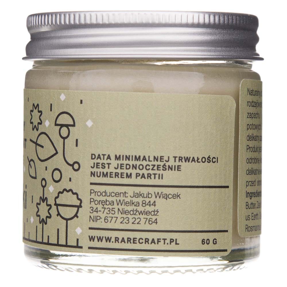 Prírodný dezodorant v kréme je ďalším z produktov značky RareCraft. Dezodorant založený na vlastnej receptúre, je poľský výrobok vytvorený v manufaktúre neďaleko Krakova. Prírodné zložky, ktoré obsahuje, zbavujú nepríjemného zápachu a absorbujú vlhkosť bez toho, aby blokovali potné žľazy. Esenciálne oleje - citrón a rozmarín dodávajú telu sviežu, jemnú vôňu, poskytujúcu pocit pohodlia počas celého dňa. Vďaka svojej ľahkej textúre, sa krém dokonale rozotiera na pokožke.