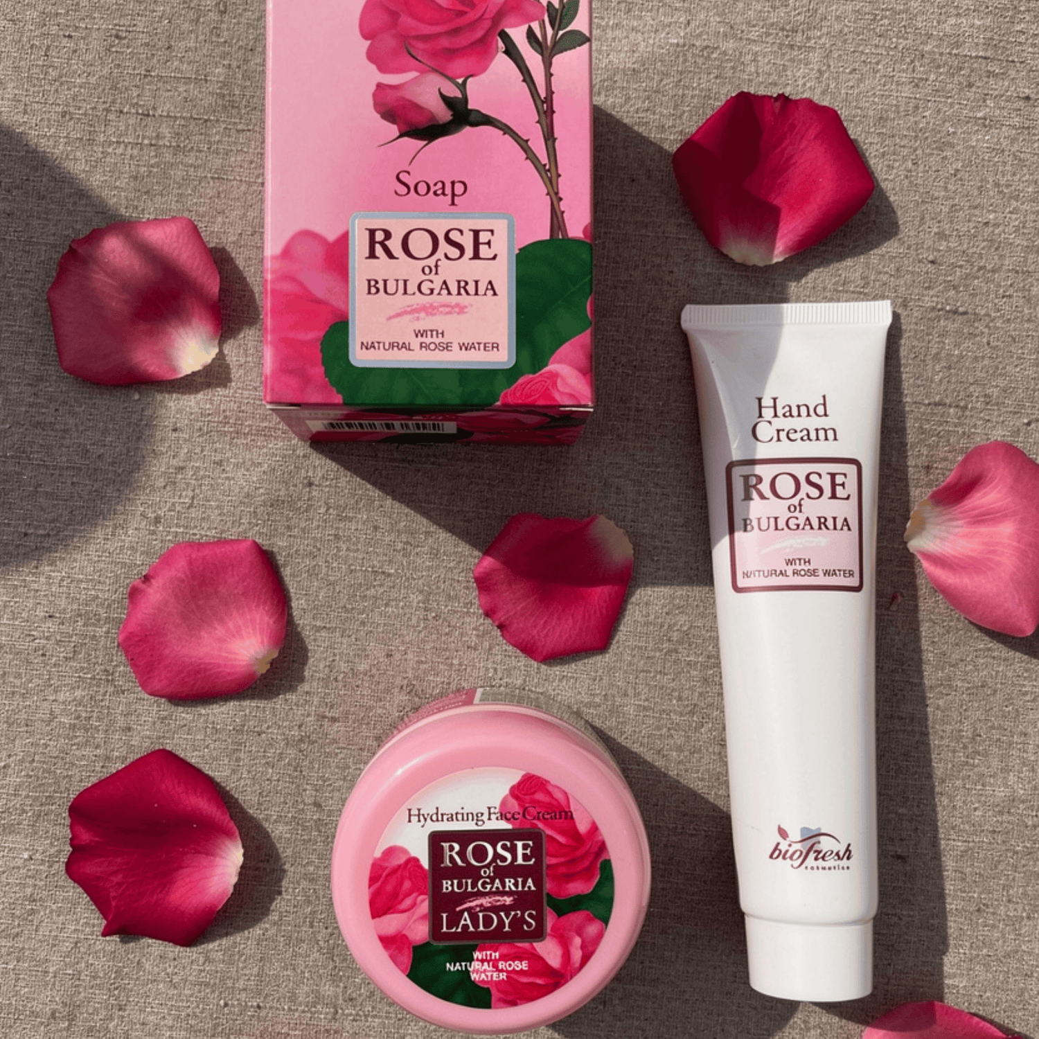 Darčeková sada Rose of Bulgaria spája tri základné produkty starostlivosti o pleť obohatené o prírodnú ružovú vodu z bulharskej ruže Rosa Damascena – jednej z najcennejších odrôd ruží na svete. Sada obsahuje výživné mydlo, zjemňujúci krém na ruky a denný hydratačný krém na tvár, čím vytvára kompletný rituál starostlivosti o pleť s pridaním ruže.