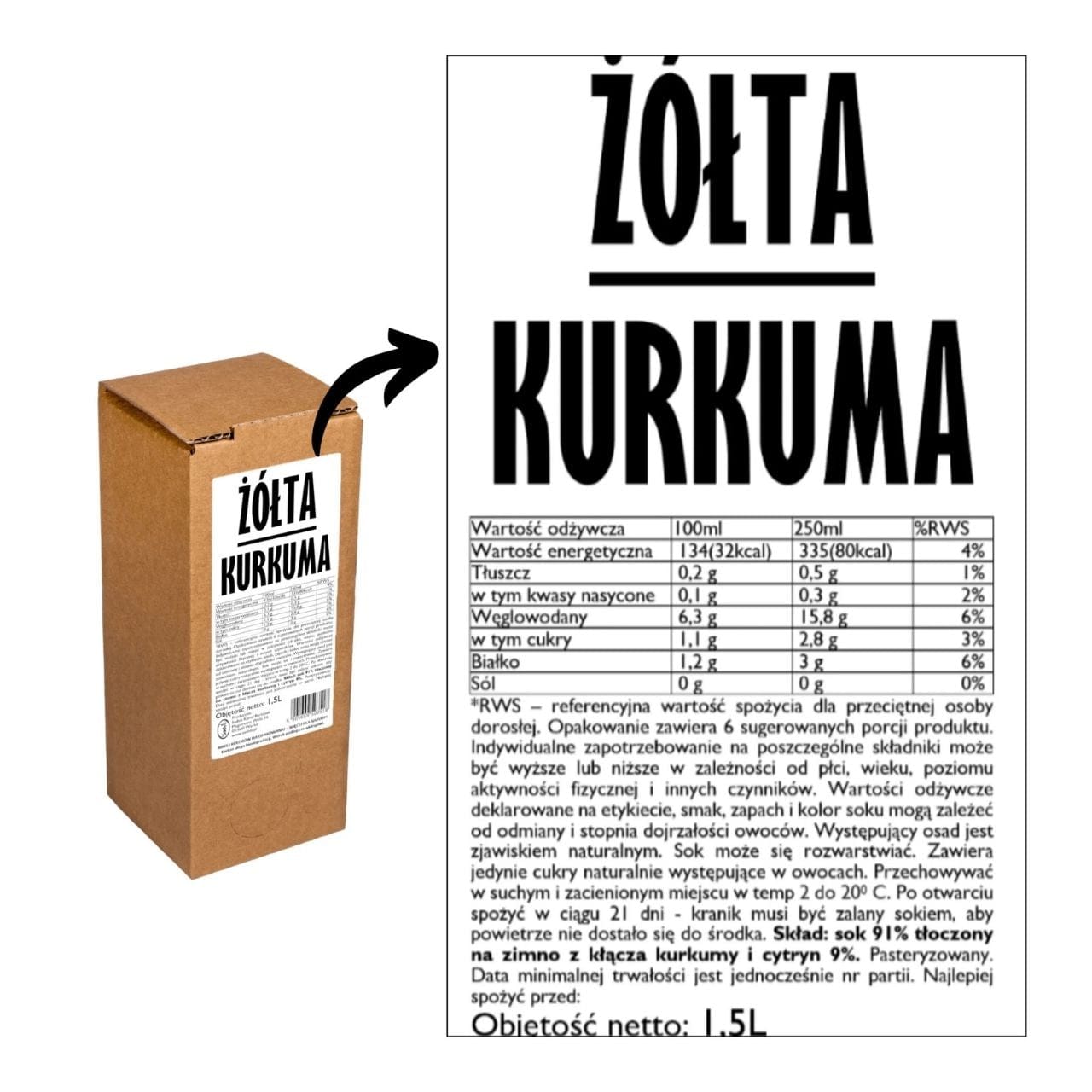 Žltá kurkumová šťava sa vyrába v poľskej rodinnej lisovni Sadvit z koreňov kurkumy dodávaných priamo z Peru. Metóda lisovania za studena NFC ( nie z koncentrátu ) zaručuje, že fľaša obsahuje čistú šťavu bez riedenia , práškových prísad alebo koncentrovaného koncentrátu. Prírodná , intenzívna chuť a aróma sú výsledkom práce výlučne s čerstvými surovinami.