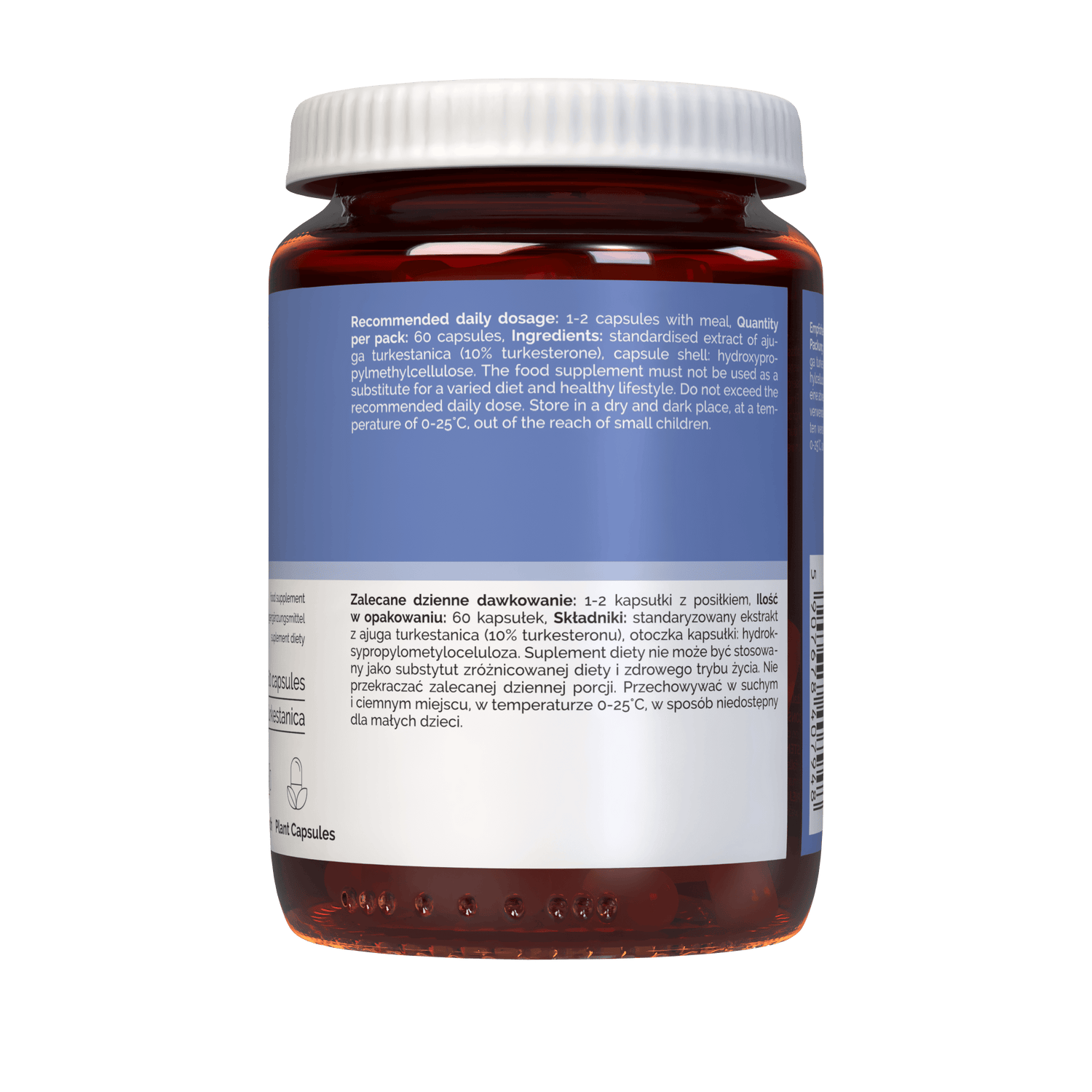 Štandardizovaný extrakt z Ajuga turkestanica (10% turkesterón), obal kapsuly (hydroxypropylmetylcelulóza).